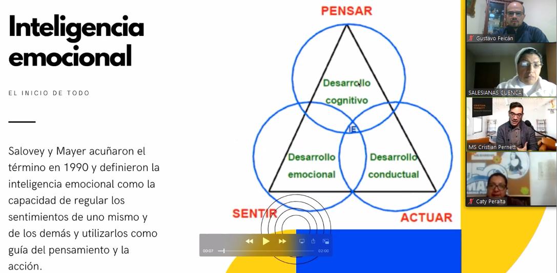La Rectora de la Unidad Educativa Particular Salesiana María Auxiliadora, en coordinación con el Departamento de Talento Humano, preocupados por la gestión emocional del personal de la Institución en esta época de pandemia, invitaron al Psicoterapeuta Mgst. Cristian Pernett para que nos brinde una conferencia virtual a la cual se la denominó “Creando con mis Emociones”.